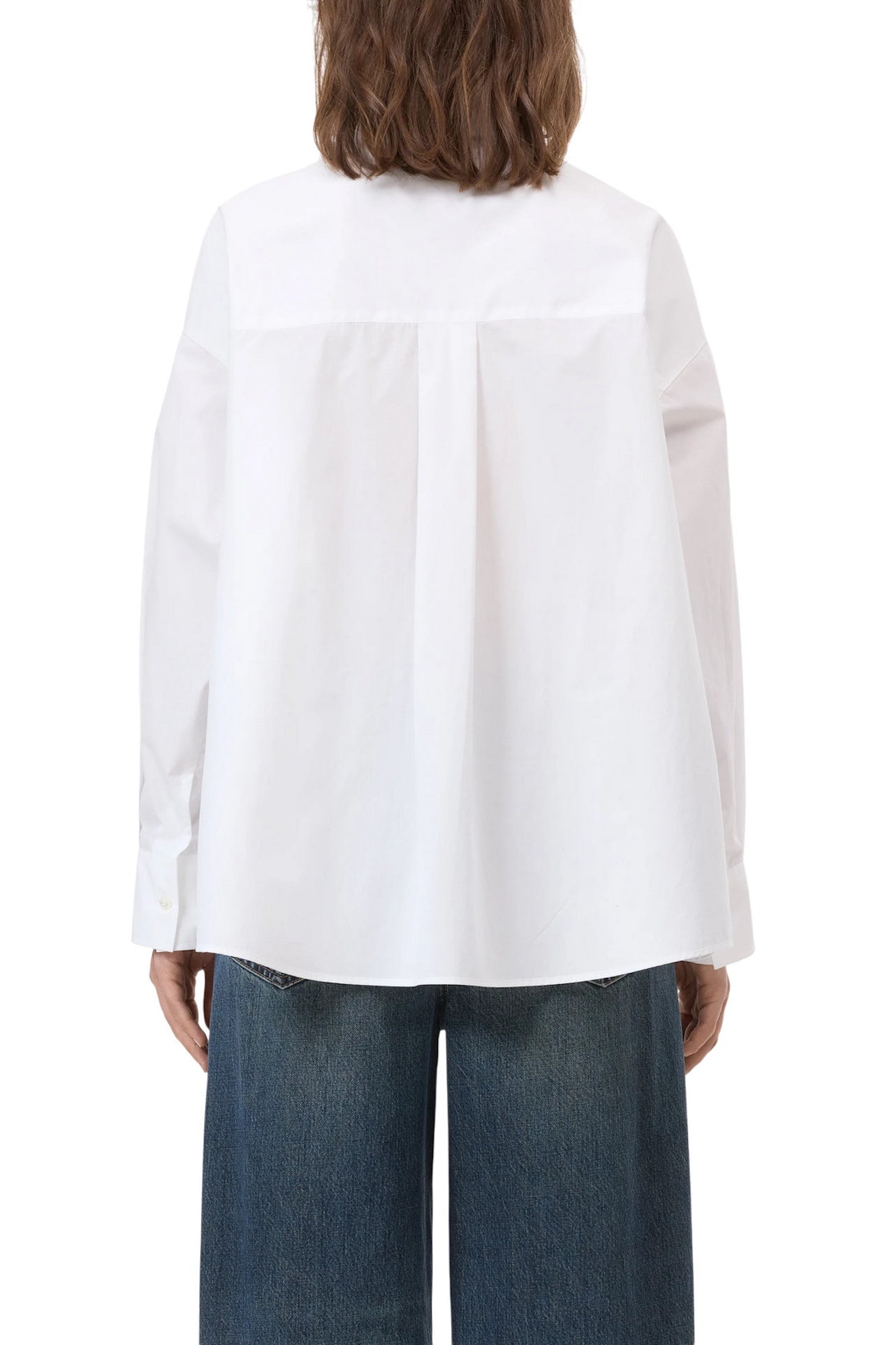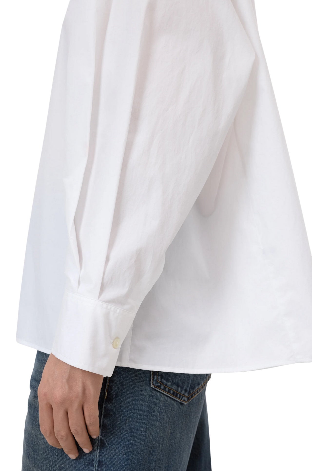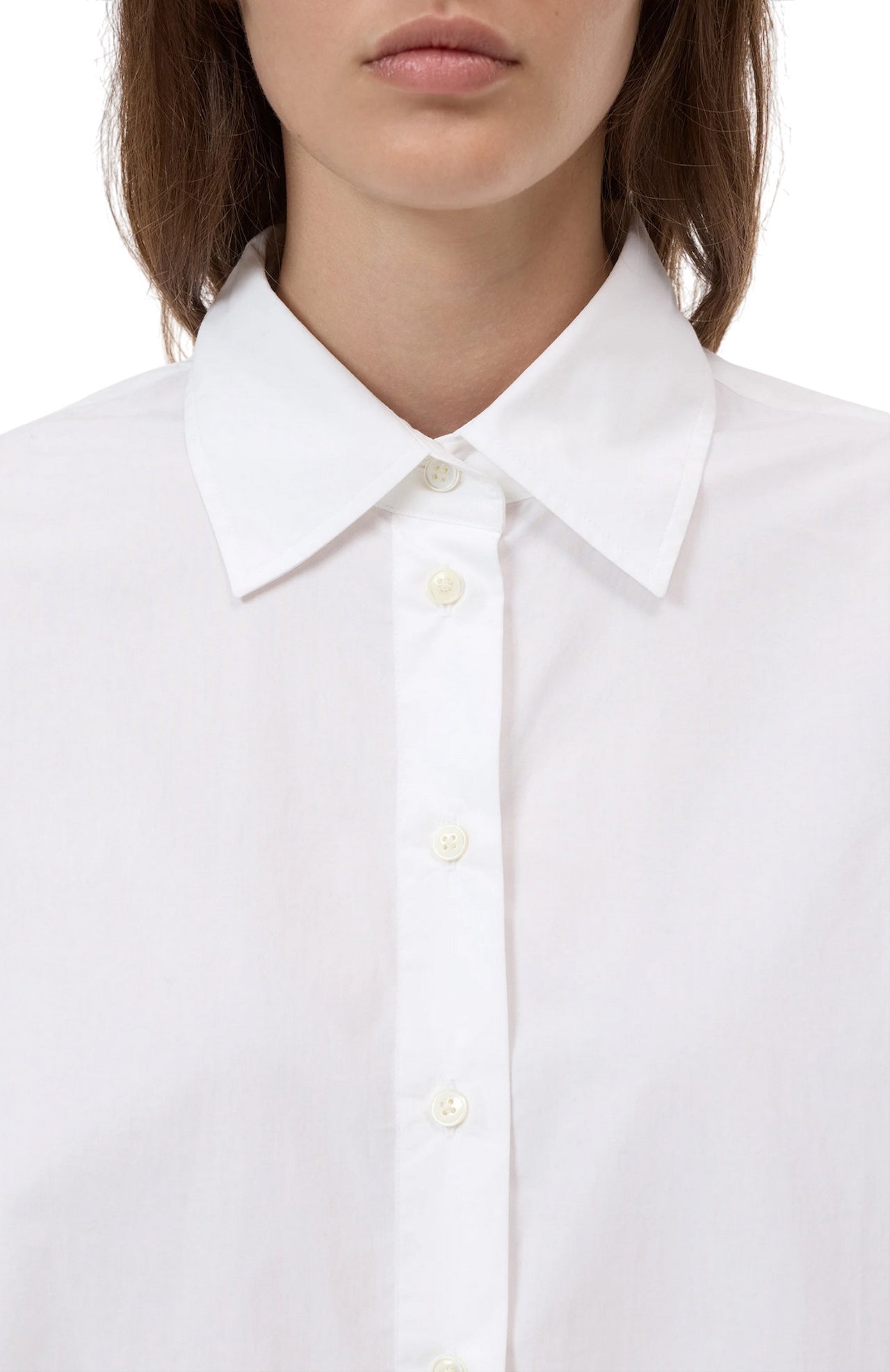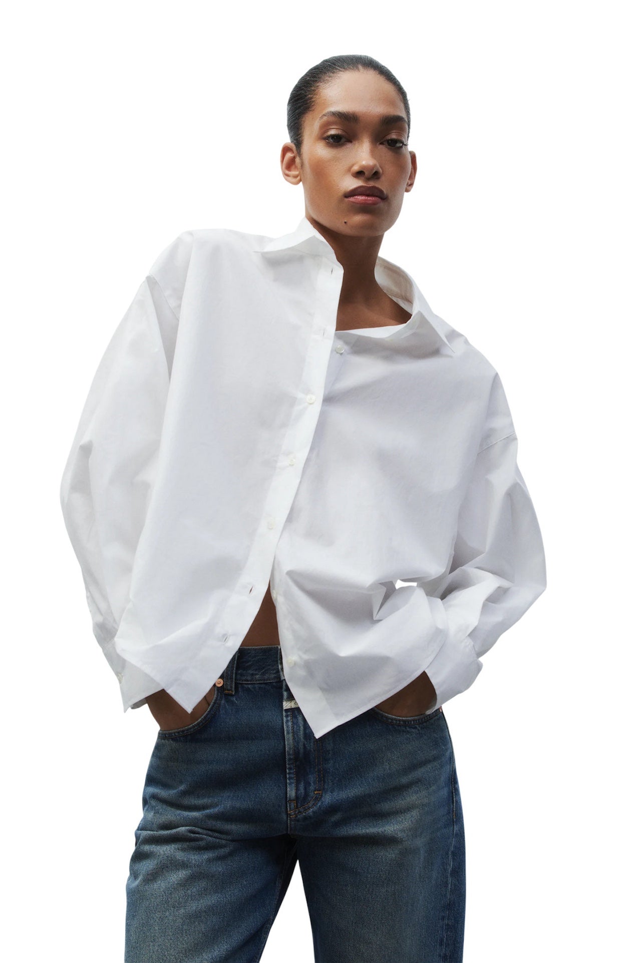 Realizzata in popeline di cotone biologico compatto, camicia a mantella dalla vestibilità comoda ha una texture effetto carta e un colletto a punta.