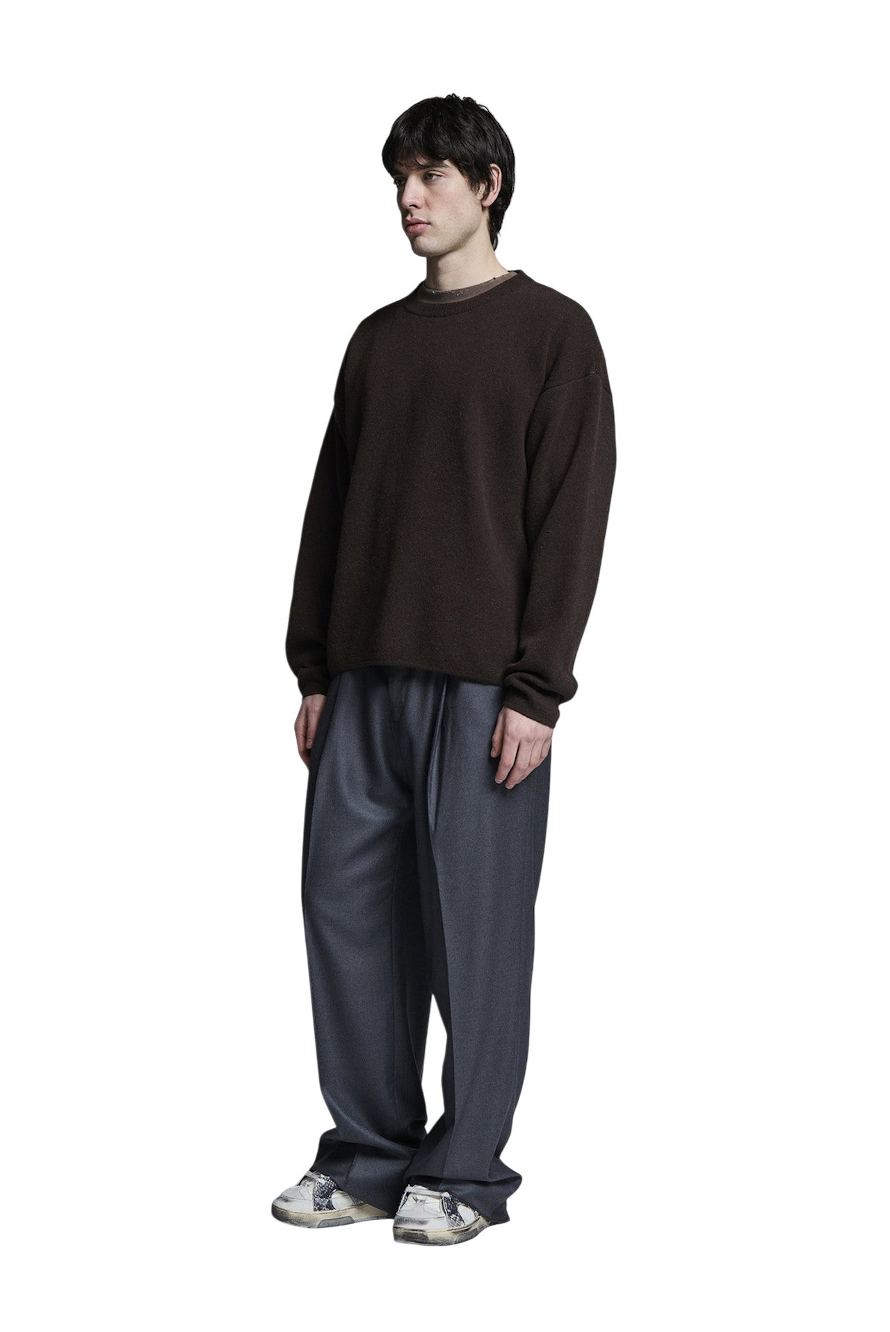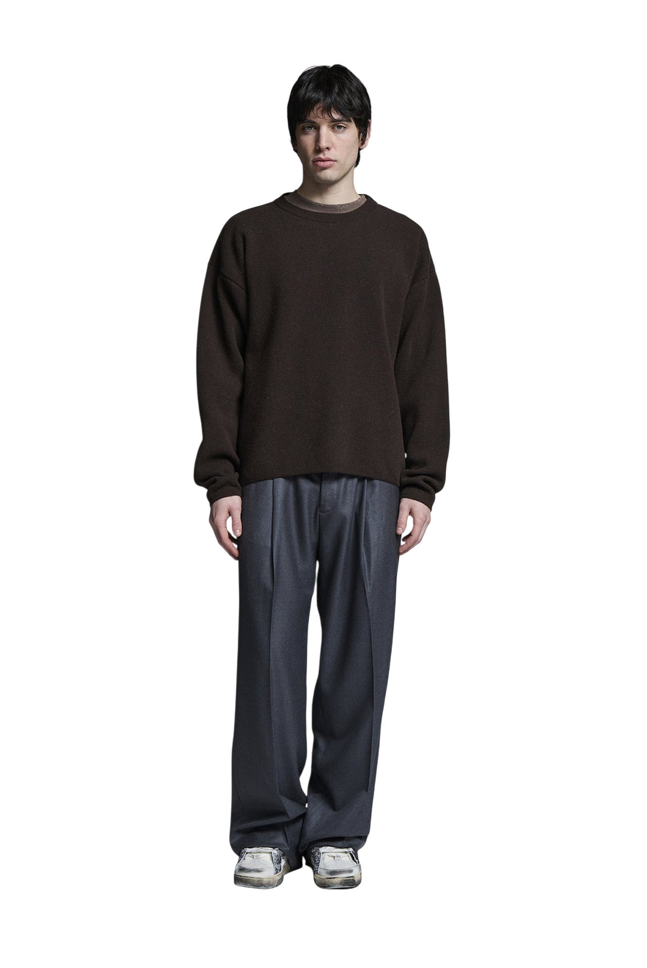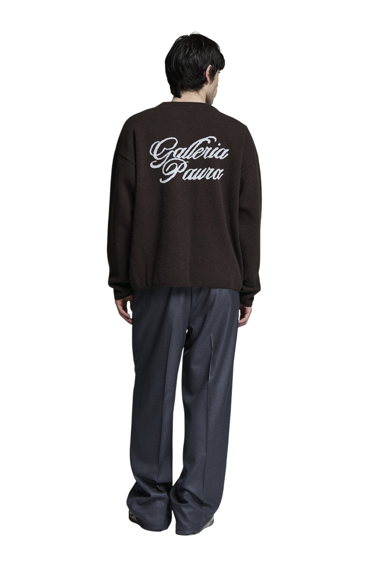 Felpa girocollo marrone scuro con intarsio "GALLERIA PAURA" sul retro.