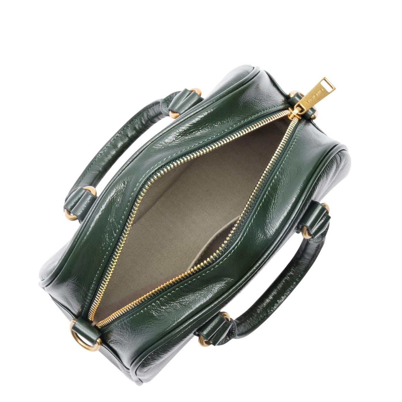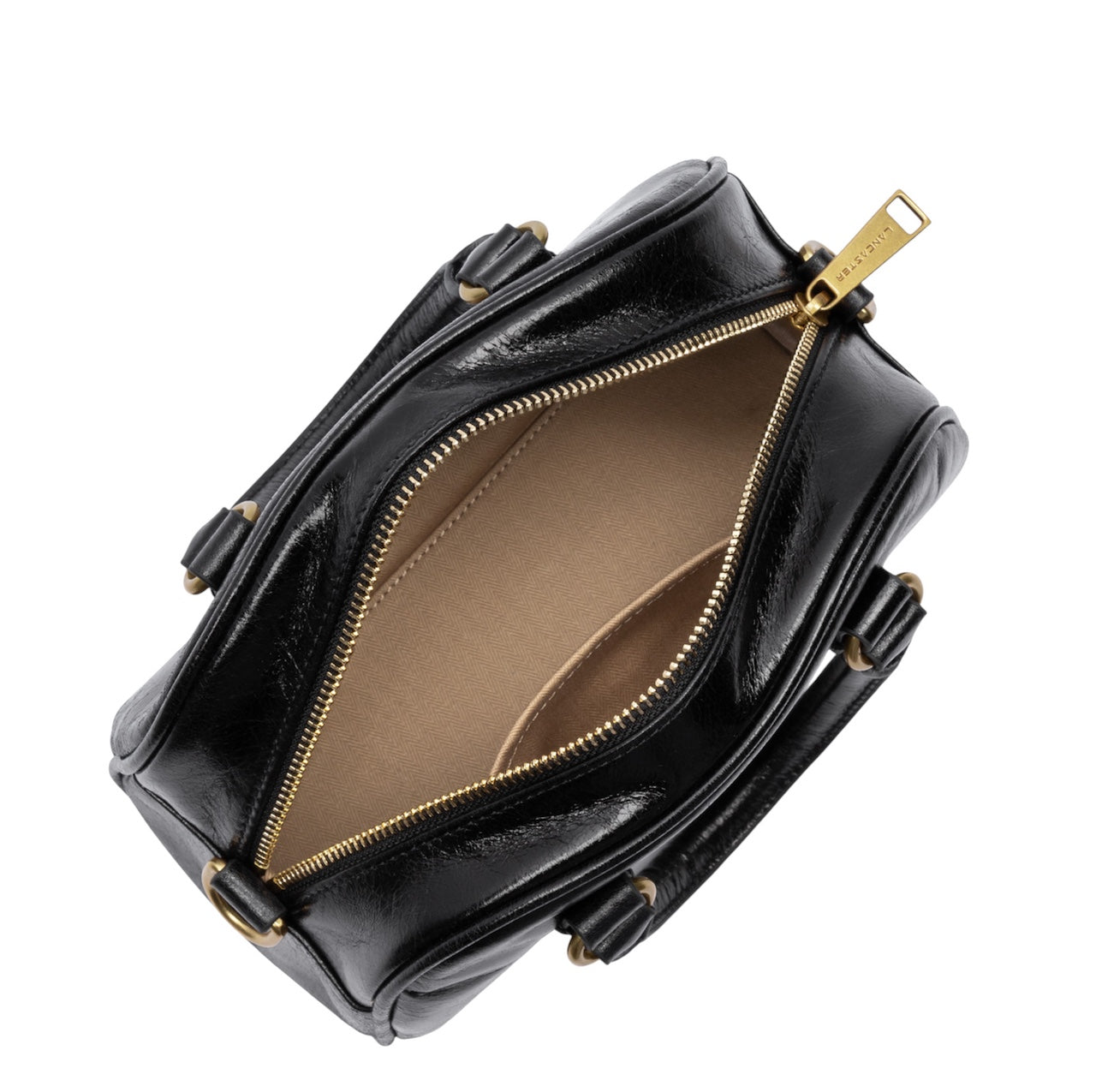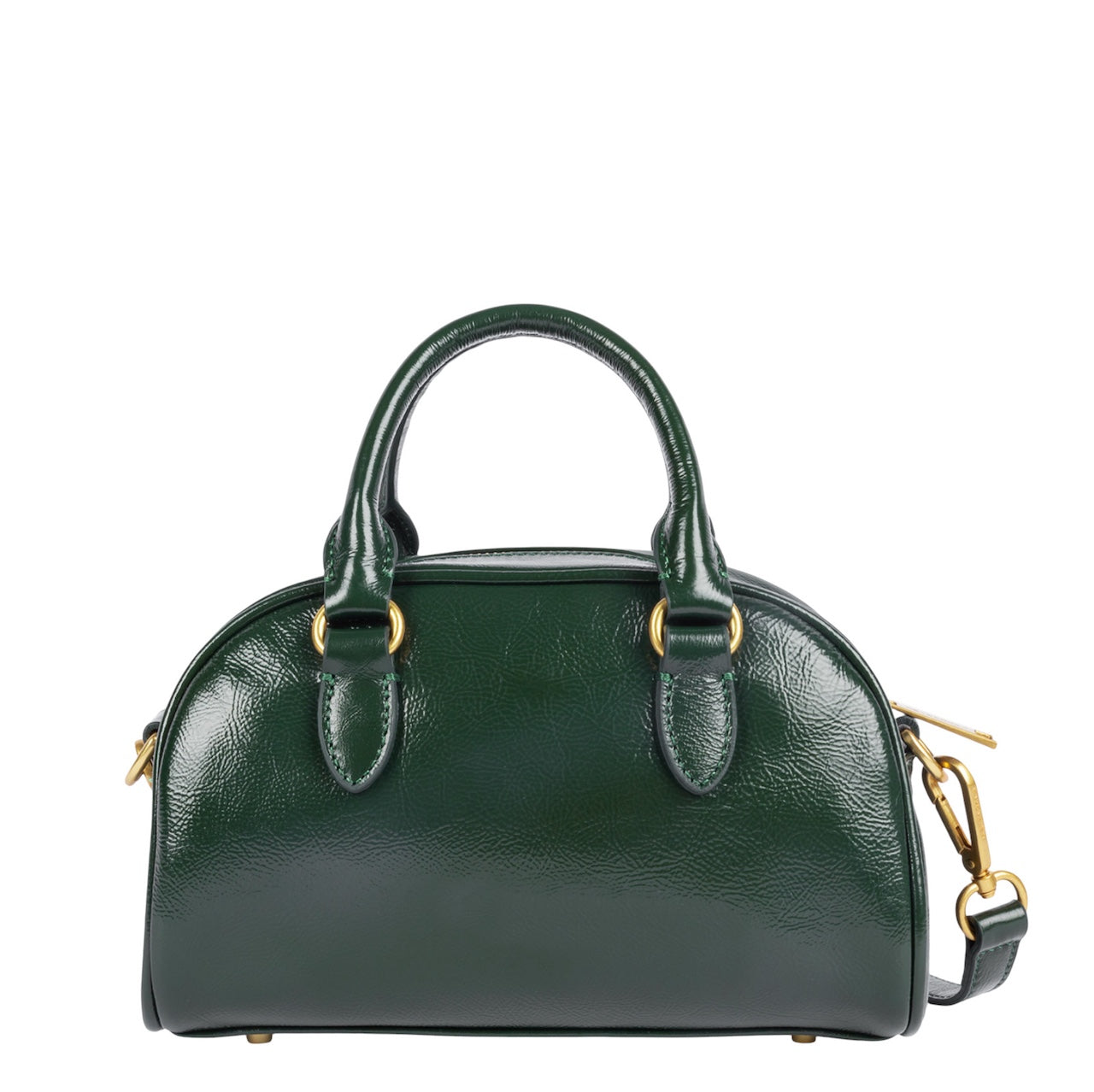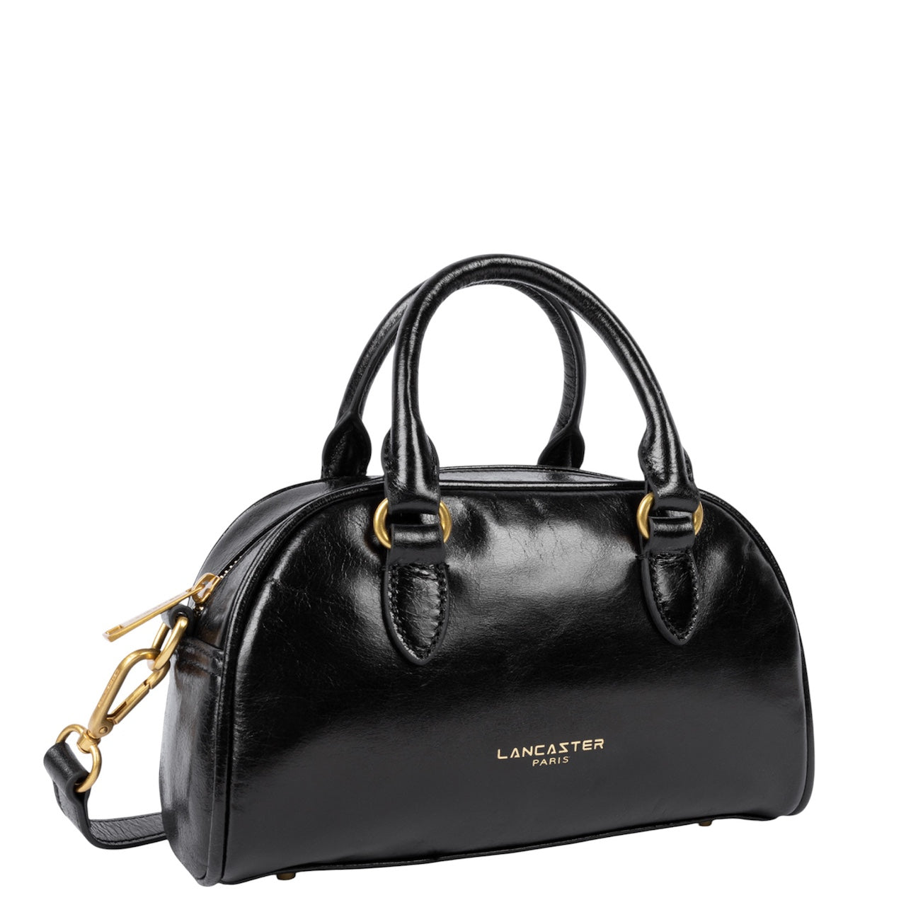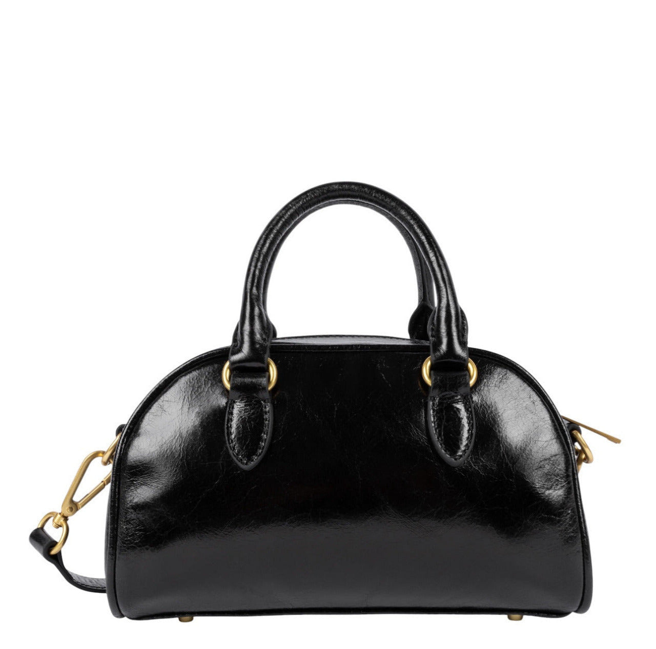 Questa mini borsa bowling è realizzata in pelle di vitello.