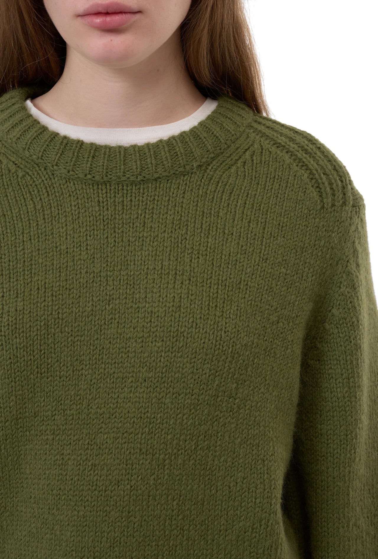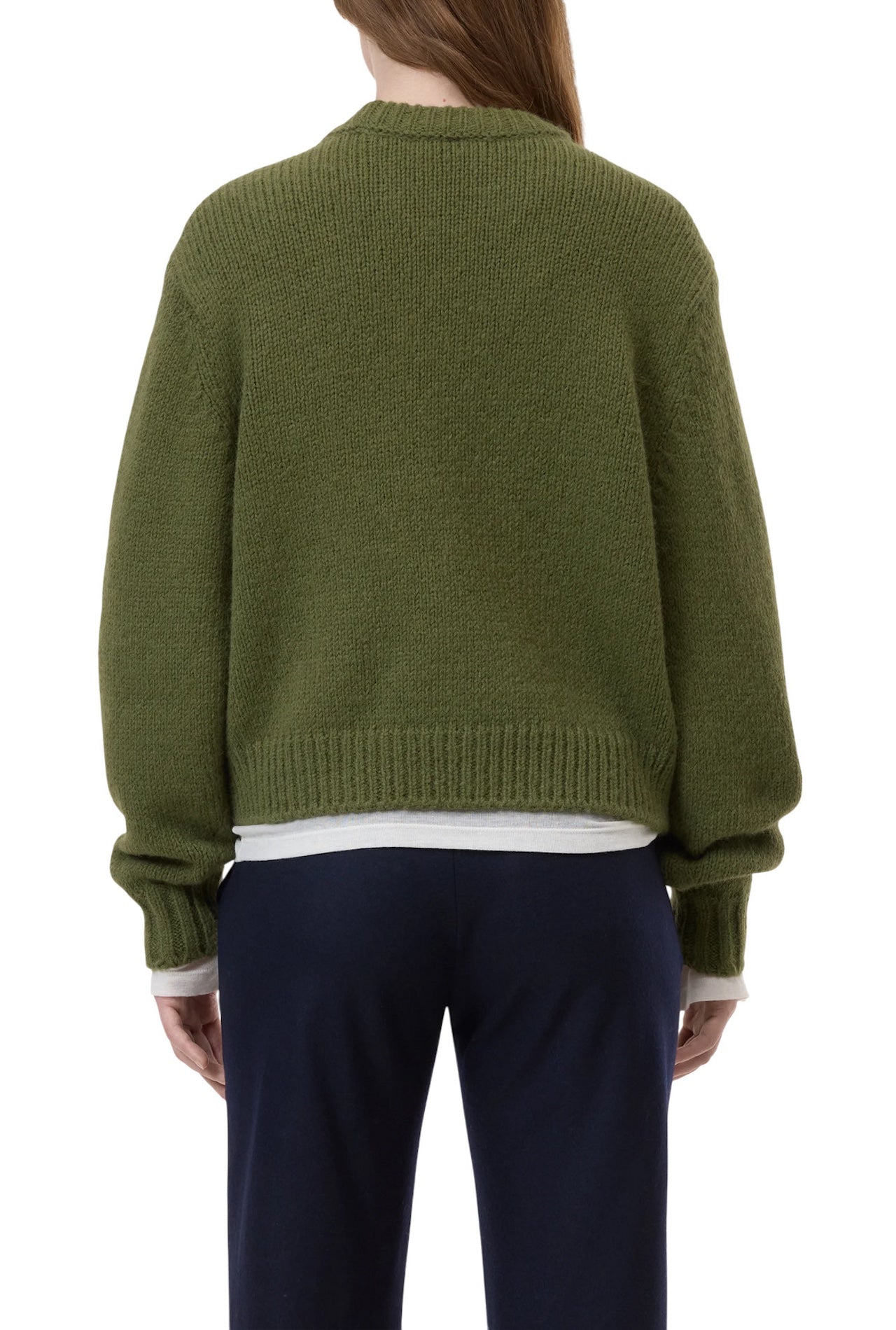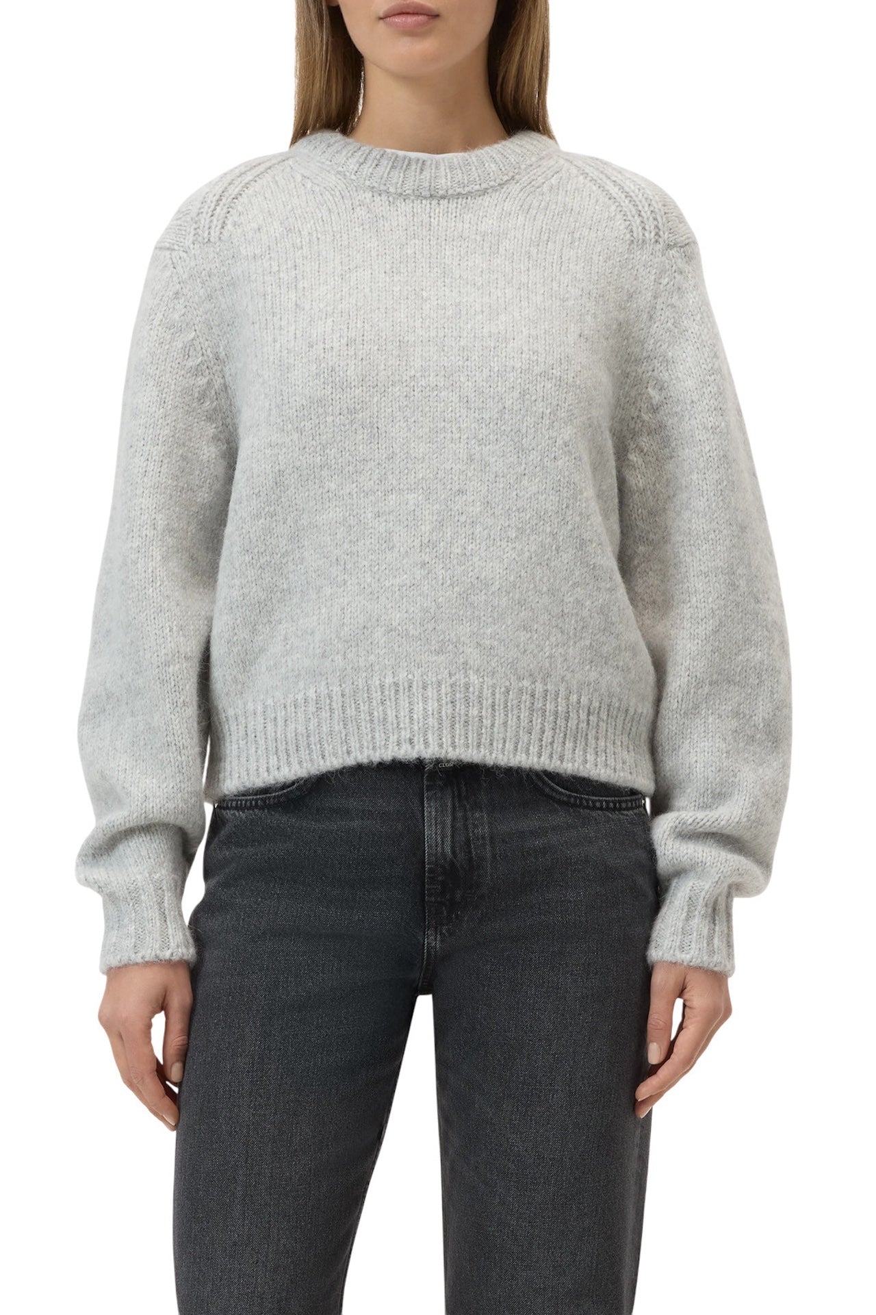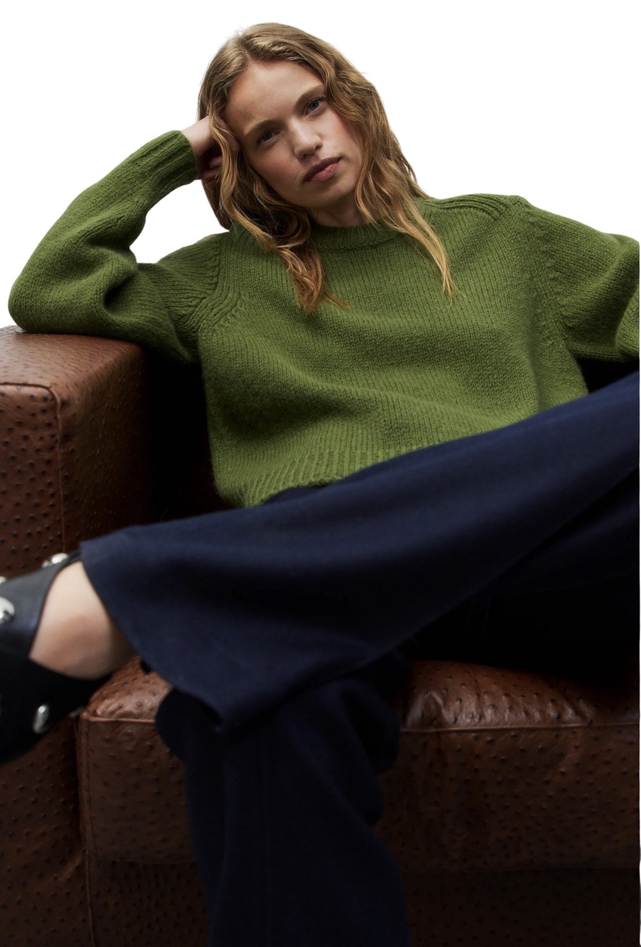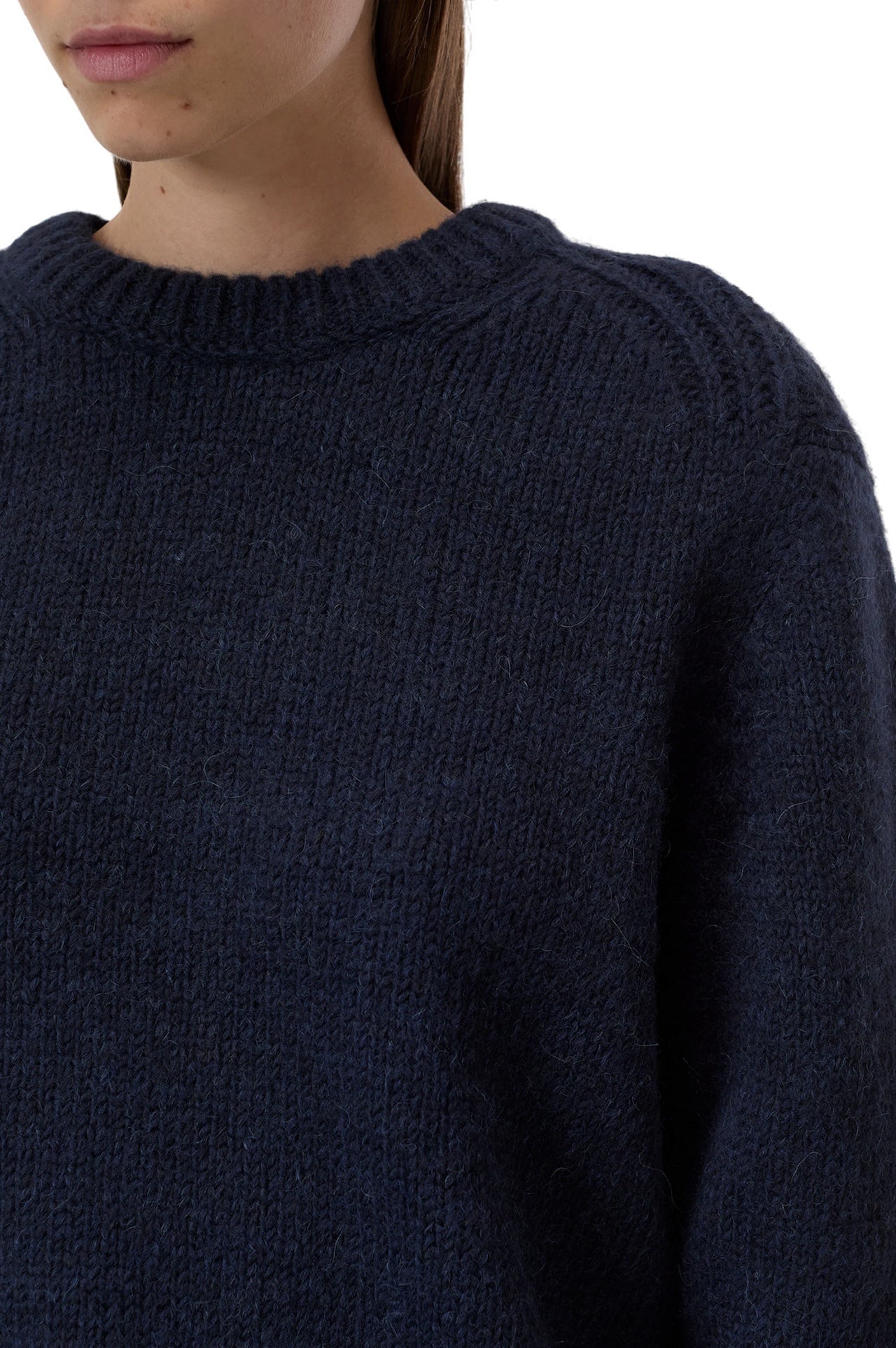 Il nostro maglione corto girocollo in maglia grossa super morbida (3 gg) è realizzato in un pregiato misto di alpaca e lana merino.