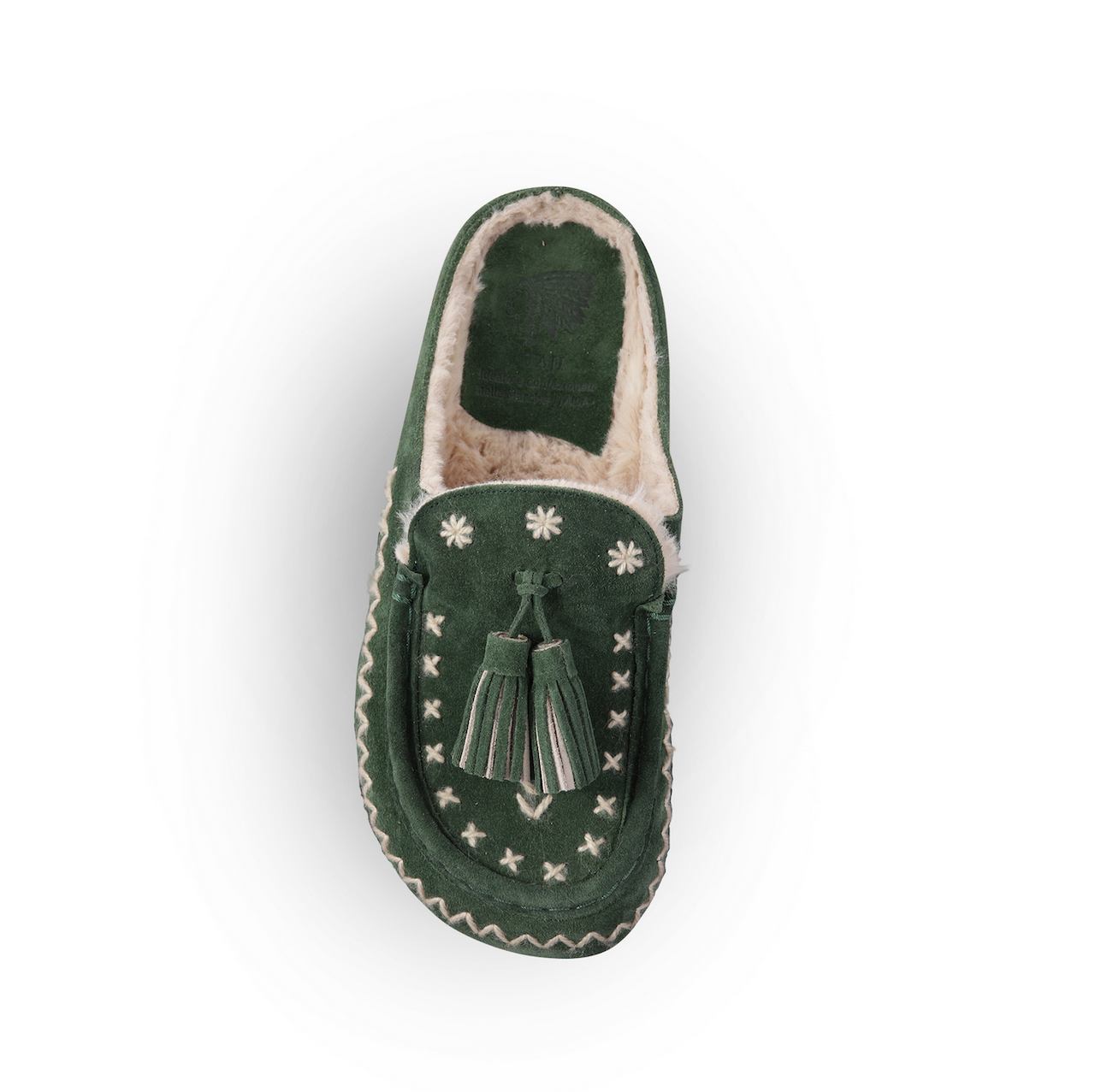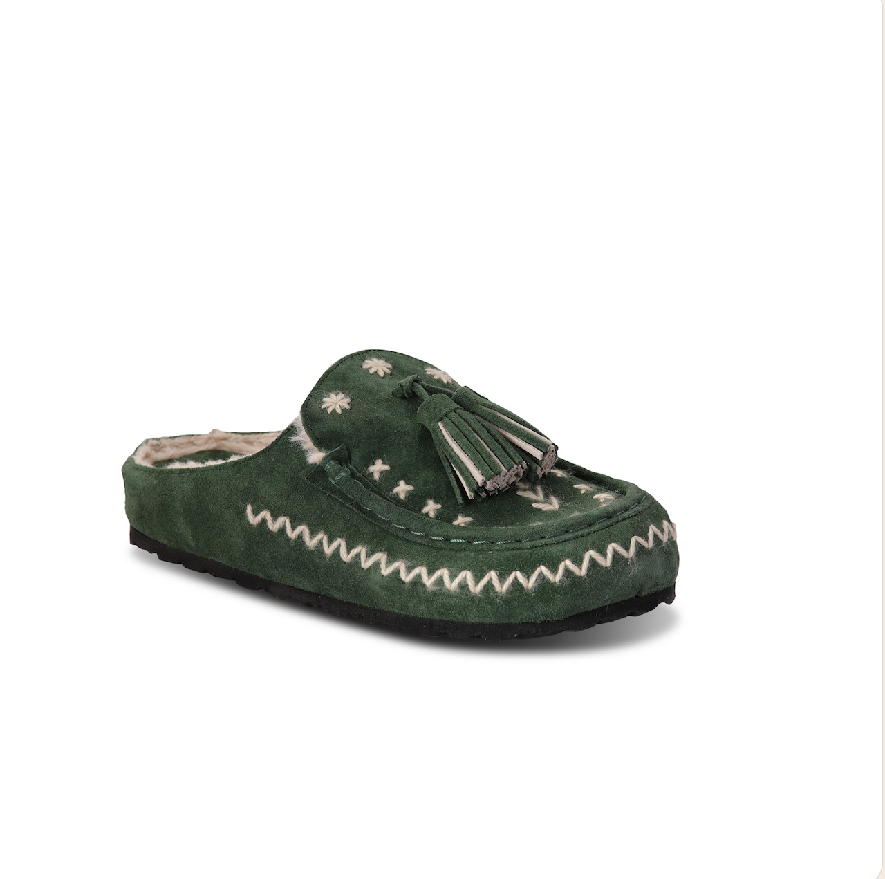 Sabot con nappine, suola anatomica foderata in eco-pelliccia color beige, tomaia con ricamo in pelle di vitello scamosciato color bosco.