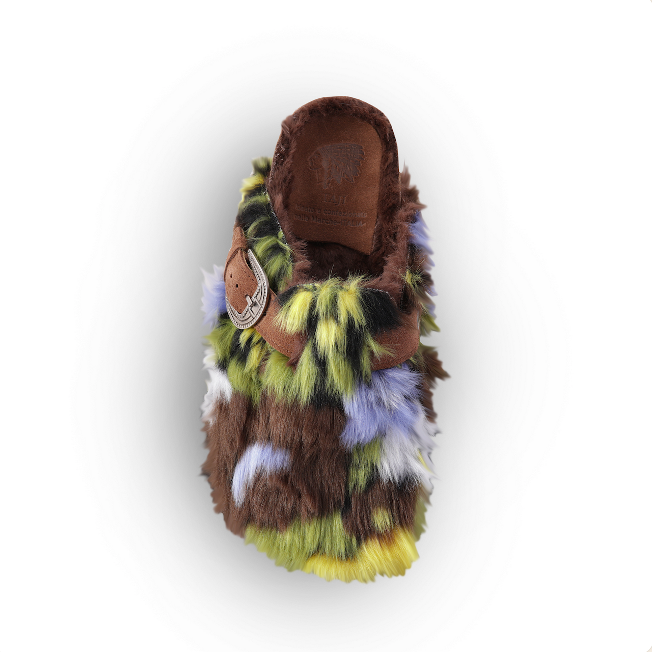 Sabot con 1 fibbia, tomaia in eco-pelliccia melange multicolor e suola anatomica foderata in eco-pelliccia color marrone.