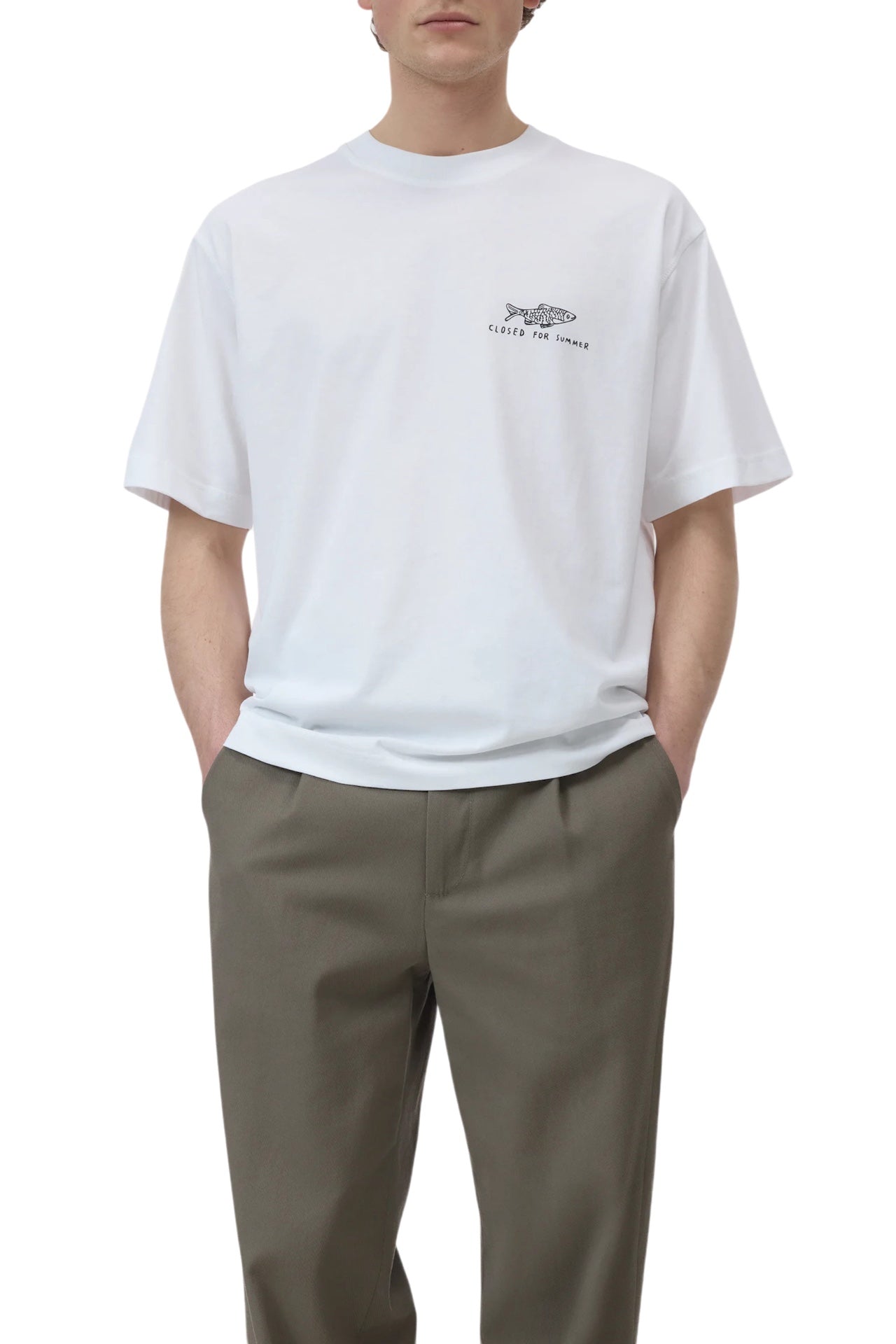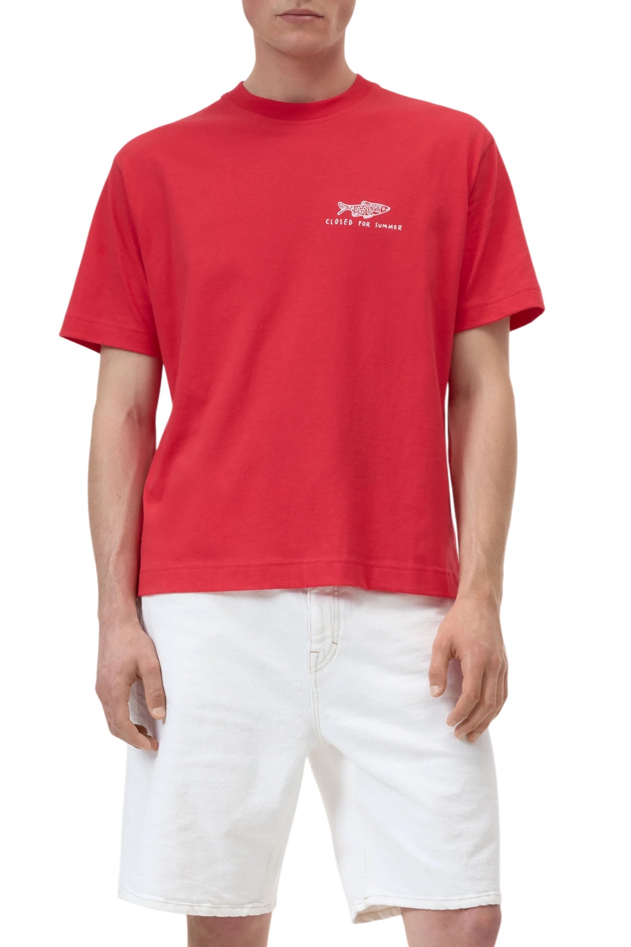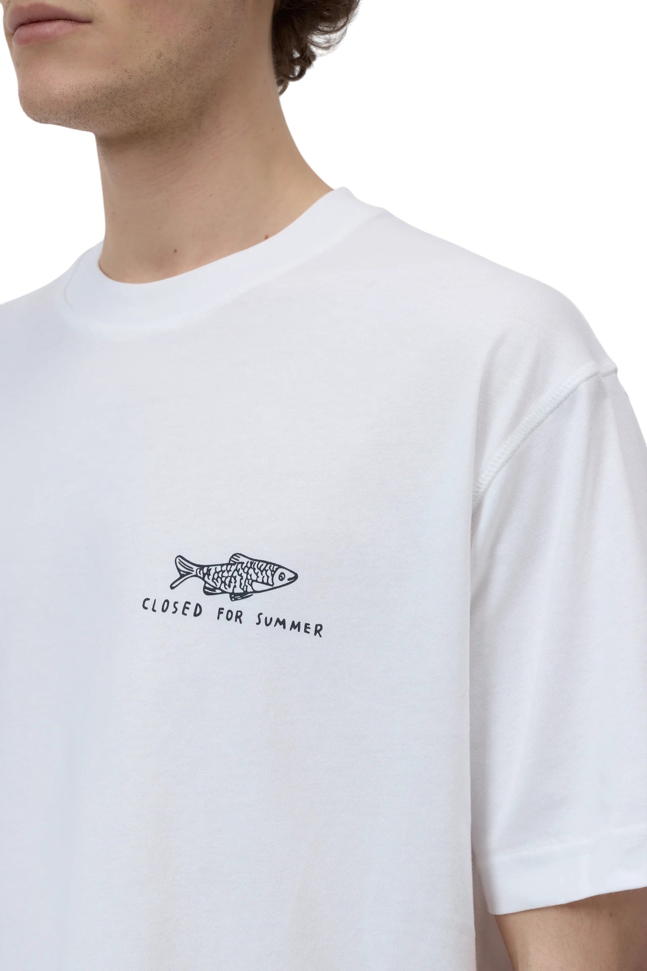 Realizzata in puro cotone biologico, questa T-shirt è stata trattata con un processo di tintura in capo e a pigmento per conferirle il suo aspetto distintivo. Ha una silhouette regolare con scollo rotondo e una stampa a forma di pesce con la scritta "Closed for Summer" sul petto.
